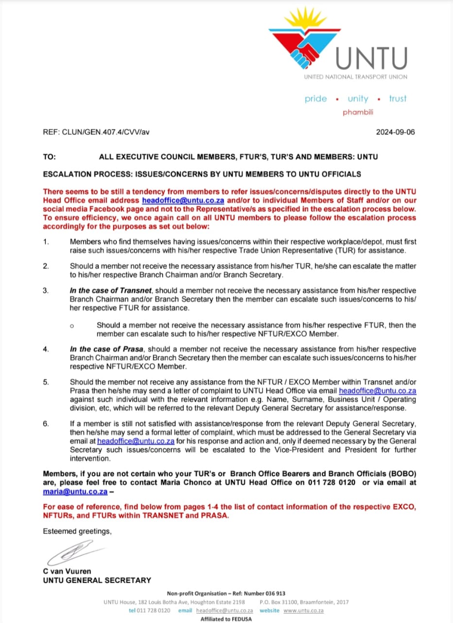 General ESCALATION PROCESS: ISSUES/CONCERNS BY UNTU MEMBERS TO UNTU OFFICIALS2024-09-06in General 0 Comments 0 Likes Download the full contact list below: GEN4074 – Escalation Process Members to UNTU Off_240906_074910 (1)
