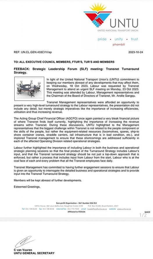 FEEDBACK: Strategic Leadership Forum meeting- Transnet Turnaround Strategy.
