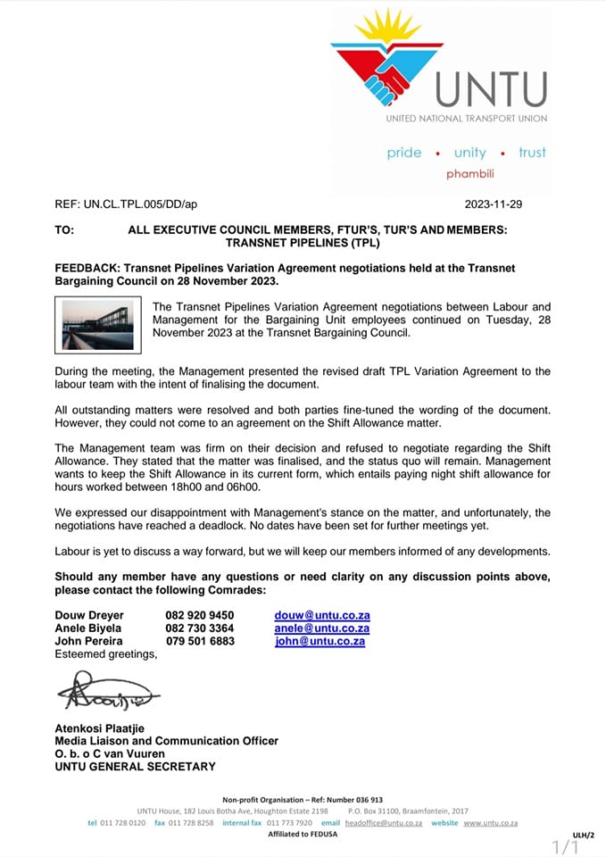 FEEDBACK: Transnet Pipelines Variation Agreement Negotiations have reached a deadlock.