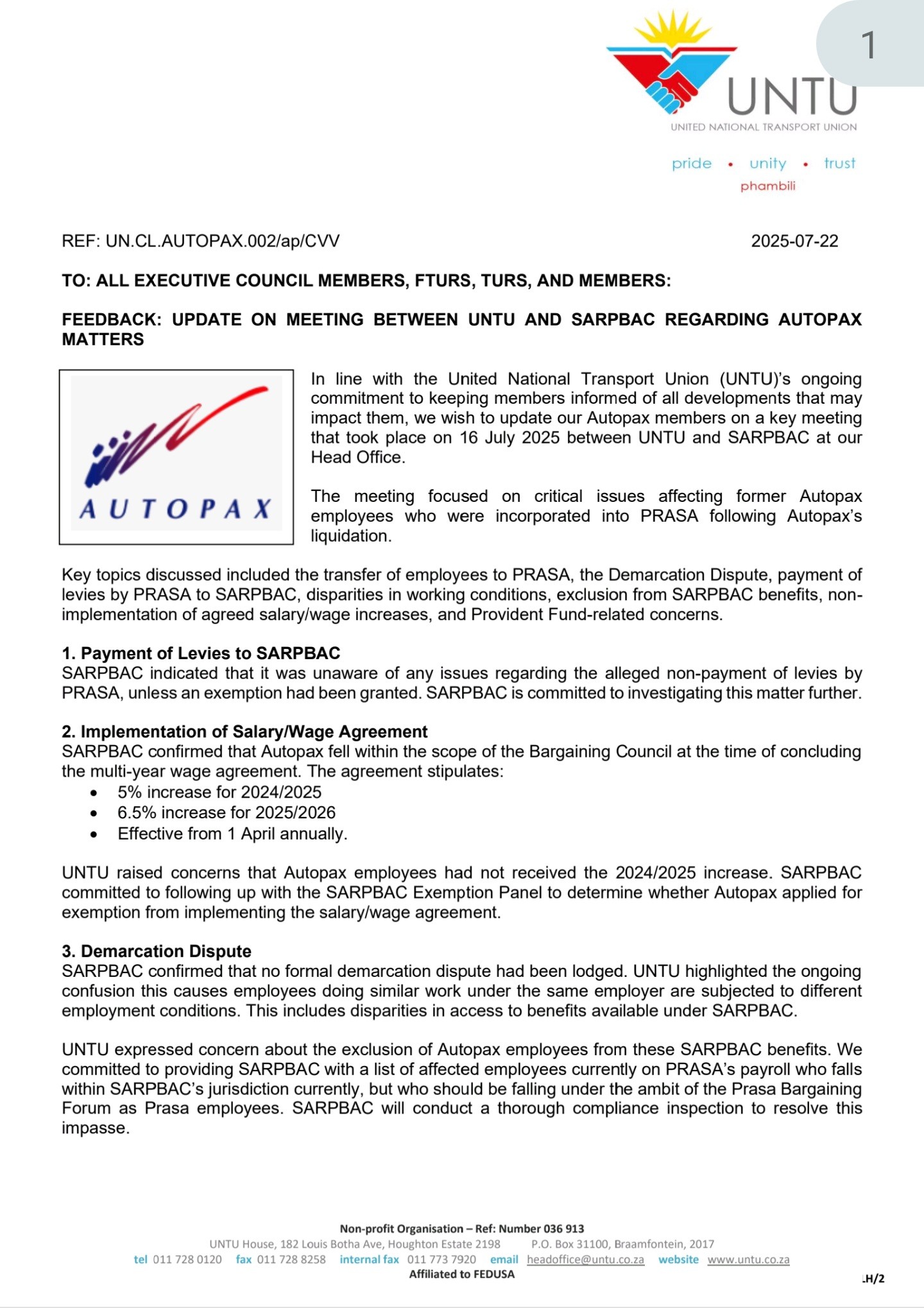 FEEDBACK: UPDATE ON MEETING BETWEEN UNTU AND SARPBAC