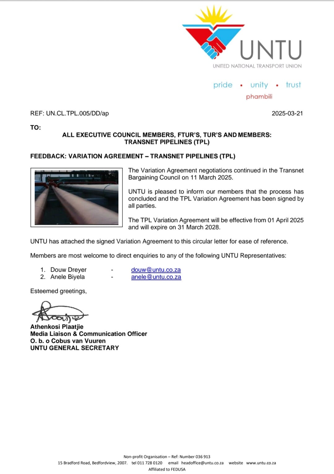 General FEEDBACK- VARIATION AGREEMENT: TRANSNET PIPELINES2025-03-21in General 0 Comments 0 Likes DOWNLOAD SIGNED TPL VARIATION AGREEMENT BELOW: Agreement – TPL VARIATION AGREEMENT_2025-2028