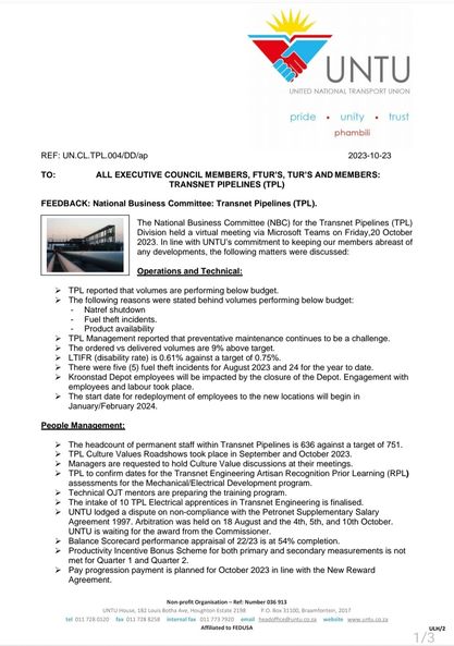 General FEEDBACK:NATIONAL BUSINESS COMMITTEE TRANSNET PIPELINES(TPL)2023-10-23in General 0 Comments 0 Likes
