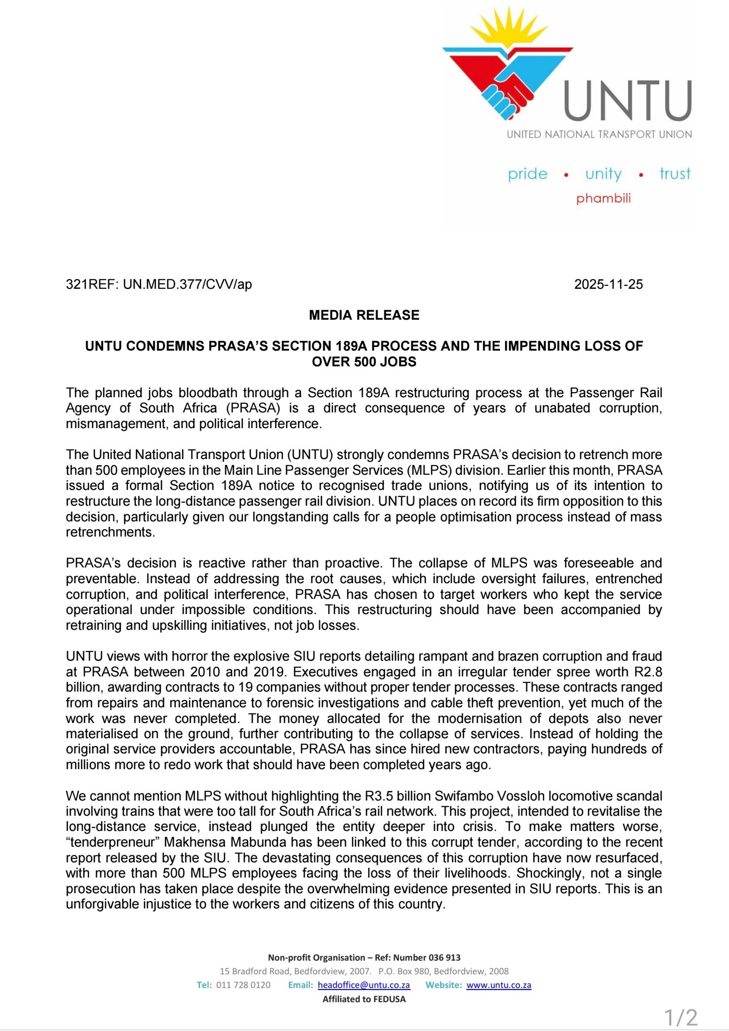 [MEDIA RELEASE] UNTU CONDEMNS PRASA’s S189 PROCESS AND THE IMPENDING LOSS OF OVER 500 JOBS
