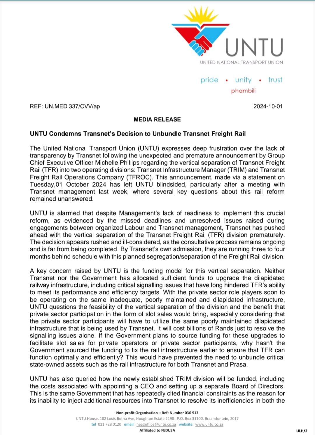 General MEDIA RELEASE] UNTU CONDEMNS TRANSNET’S DECISION TO UNBUNDLE TRANSNET FREIGHT RAIL.2024-10-02in General 0 Comments 0 Likes