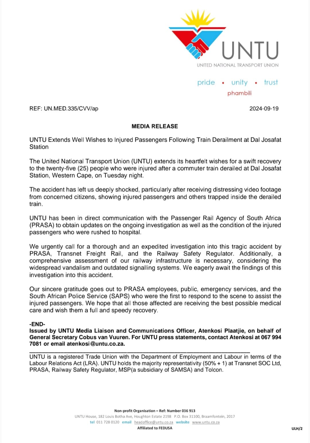 General [MEDIA RELEASE] UNTU Extends Well Wishes To Injured Passengers Following Train Derailment at Dal Josafat Station.2024-09-19in General 0 Comments 0 Likes