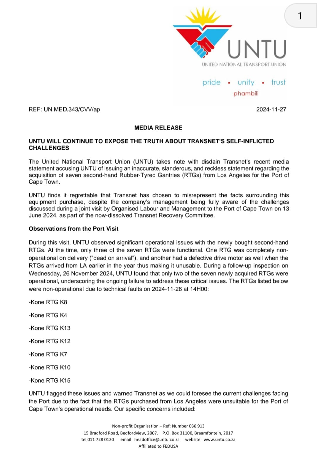 General [MEDIA STATEMENT] UNTU WILL CONTINUE TO EXPOSE Transnet SOC Ltd SELF-INFLICTED CHALLENGES2024-11-28in General 0 Comments 0 Likes