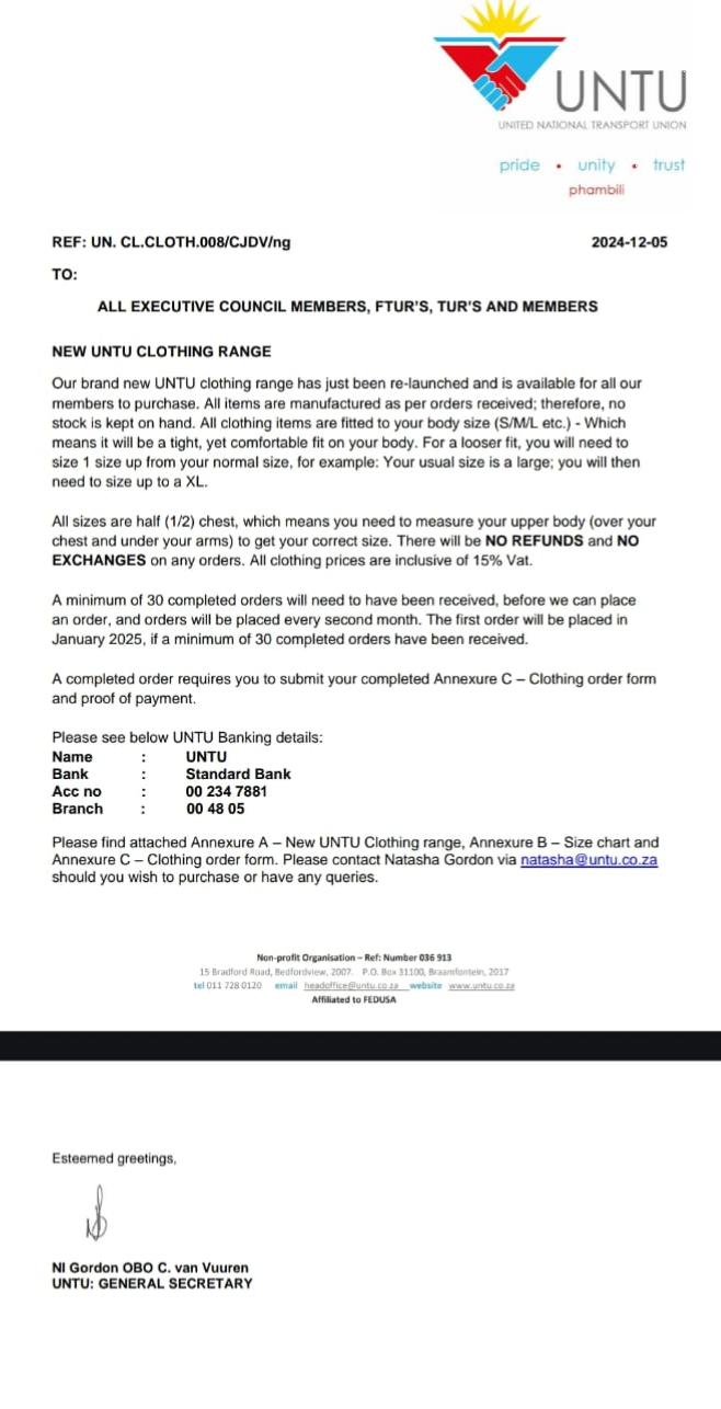 Annexure C – Clothing order form: http://www.untu.co.za/assets/Annexure-C-Clothing-order-form.pdf
