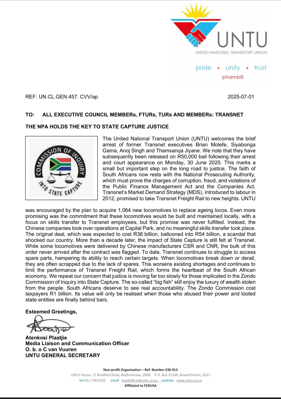 Phone: 011 728 0120/1/2/3 Email: headoffice@untu.co.za | enquiries@untu.co.za
