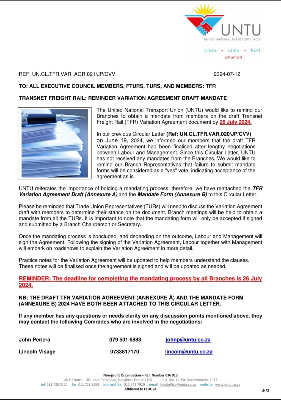 General TRANSNET FREIGHT RAIL: REMINDER VARIATION AGREEMENT DRAFT MANDATE2024-07-12in General 0 Comments 0 Likes DOWNLOAD FORMS BELOW: ANNEXURE A TFR Variation Agreement 2024-2029 – Draft 3, 7 June 2024 (1) ANNEXURE B Variation Agreement MANDATE FORM 2024 (1)