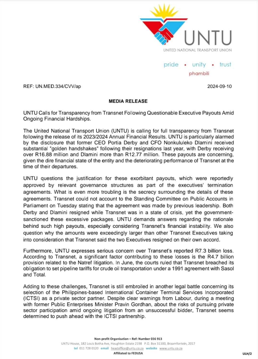 UNTU Calls For Transparency From Transnet Following Questionable Executive Payouts Amid Ongoing Financial Hardships.