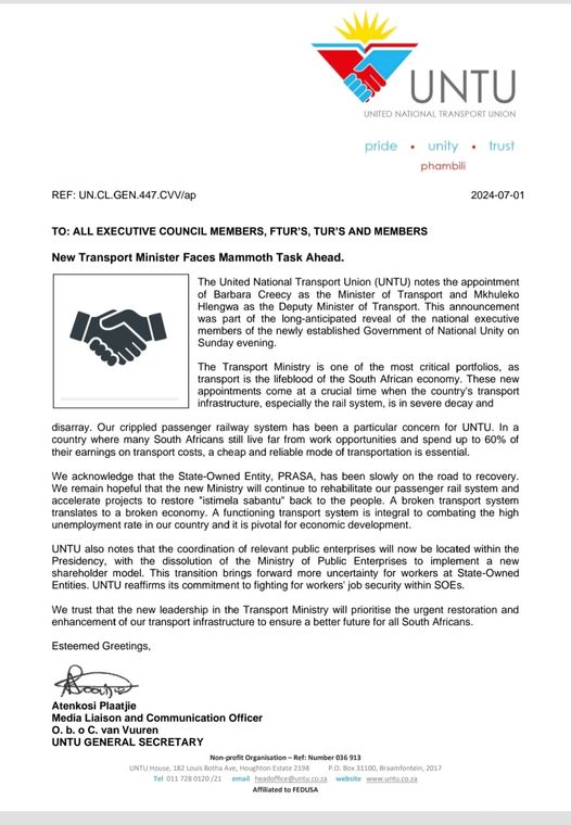[UNTU STATEMENT] NEW TRANSPORT MINISTER FACES A MAMMOTH TASK AHEAD.