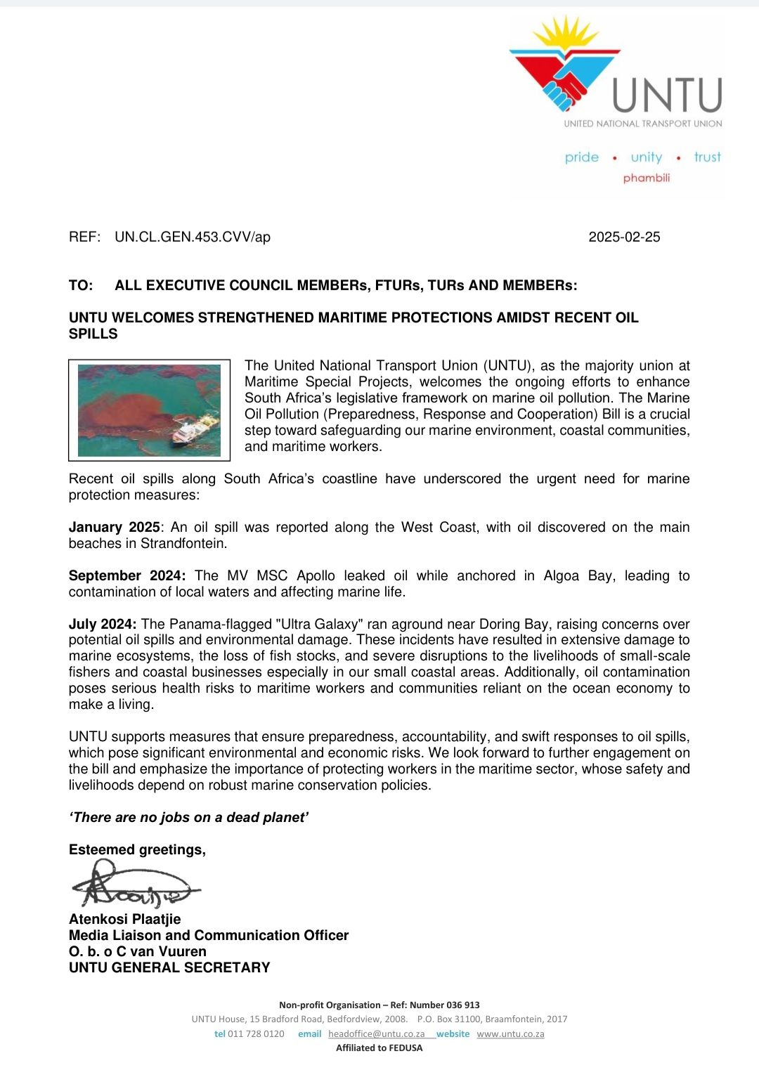 UNTU WELCOMES STRENGTHENED MARITIME PROJECTIONS AMID RECENT OIL SPILLS