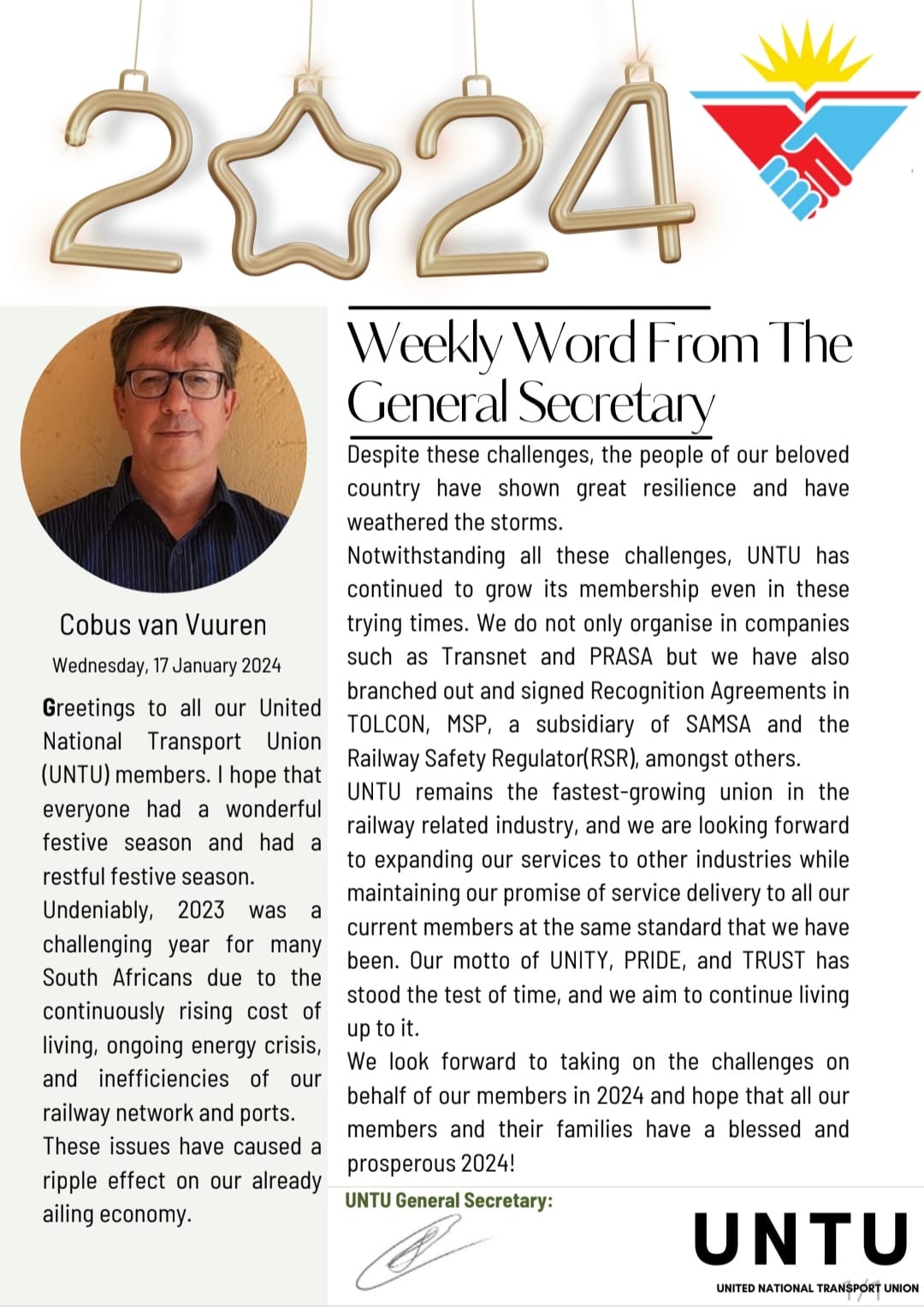 General #UNTUCARES: WEEKLY WORD FROM GENERAL SECRETARY COBUS VAN VUUREN2024-01-18in General 0 Comments 0 Likes