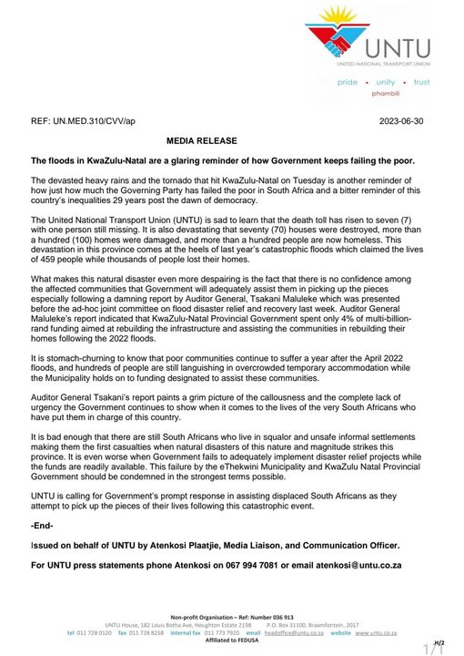 General Media THE FLOODS IN KWAZULU-NATAL ARE A GLARING REMINDER OF HOW GOVERNMENT KEEPS FAILING THE POOR2023-06-30in General 0 Comments 0 Likes