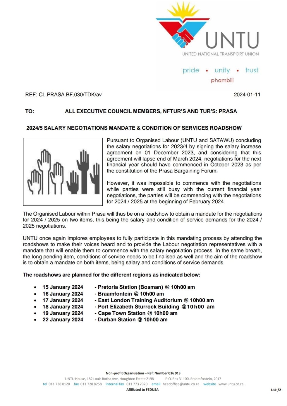 General Prasa 2024/5 SALARY NEGOTIATIONS MANDATE & CONDITION OF SERVICES ROADSHOW2024-01-11in General 0 Comments 0 Likes
