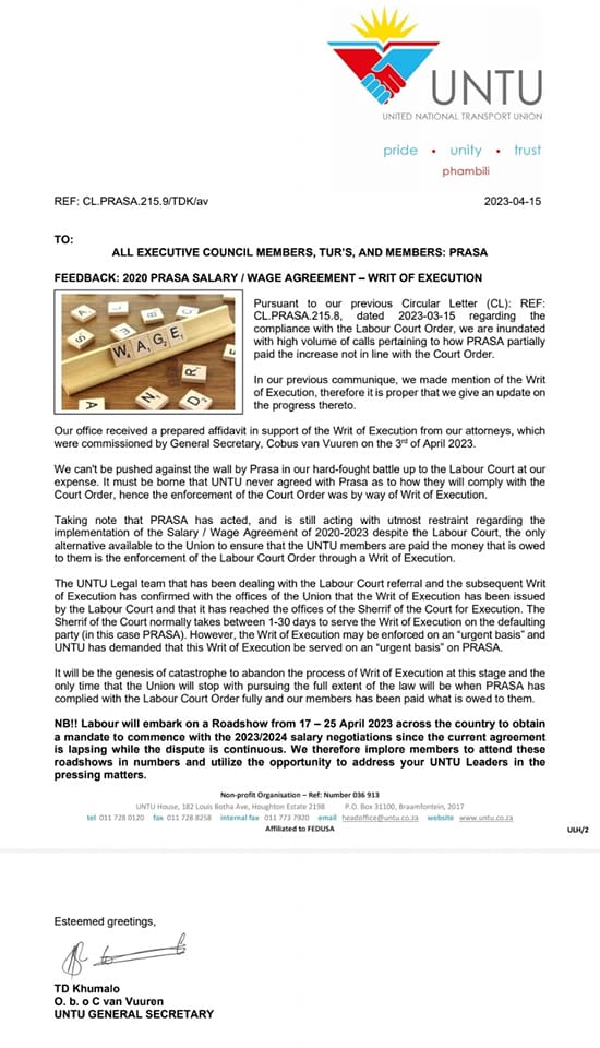FEEDBACK: 2020 PRASA SALARY/WAGE AGREEMENT- WRIT OF EXECUTION