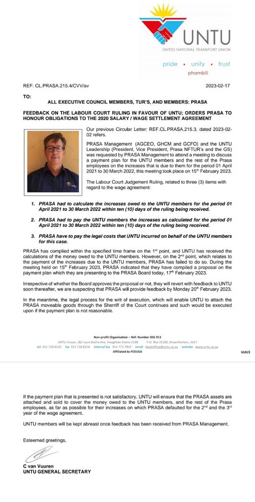 FEEDBACK ON THE LABOUR COURT RULING IN FAVOUR OF UNTU; ORDERS PRASA TO HONOUR OBLIGATIONS TO THE 2020 SALARY / WAGE SETTLEMENT AGREEMENT