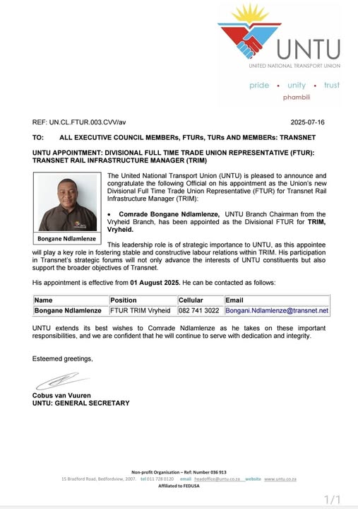 UNTU APPOINTMENT: DIVISIONAL FULL-TIME UNION REPRESENTATIVES( FTUR): TRANSNET RAIL INFRASTRUCTURE MANAGER( TRIM)