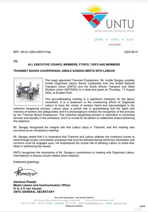 General Transnet FEEDBACK: TRANSNET BOARD CHAIRPERSON, ANDILE SANGQU, MEETS WITH LABOUR2023-08-22in General 0 Comments 0 Likes