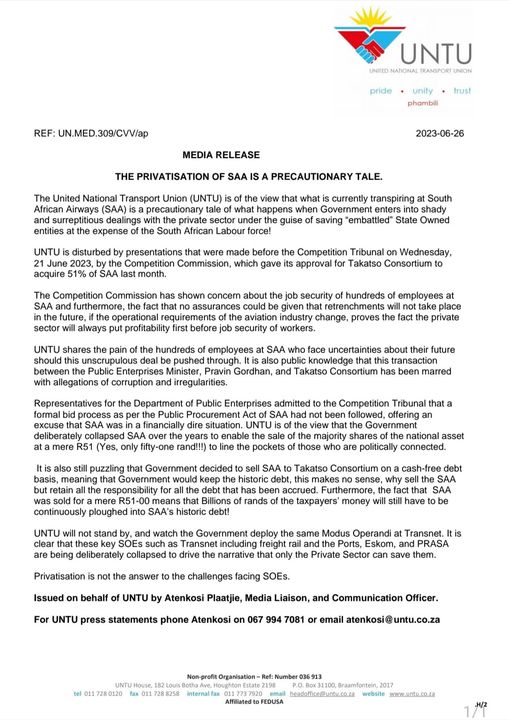 General UNTU Press Releases THE PRIVATISATION OF SAA IS A PRECAUTIONARY TALE2023-06-29in General 0 Comments 0 Likes