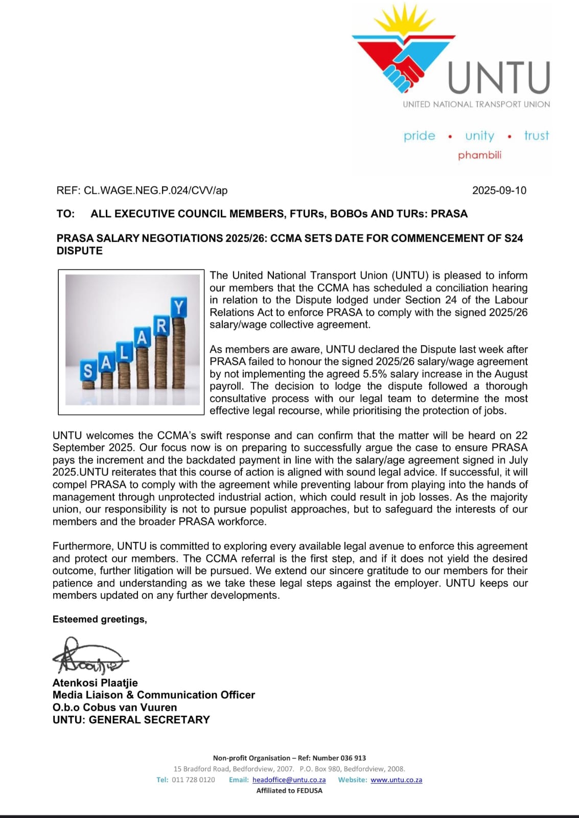 FEEDBACK: PRASA SALARY NEGOTIATIONS 2025/26: CCMA SETS DATE FOR COMMENCEMENT OF S24 DISPUTE