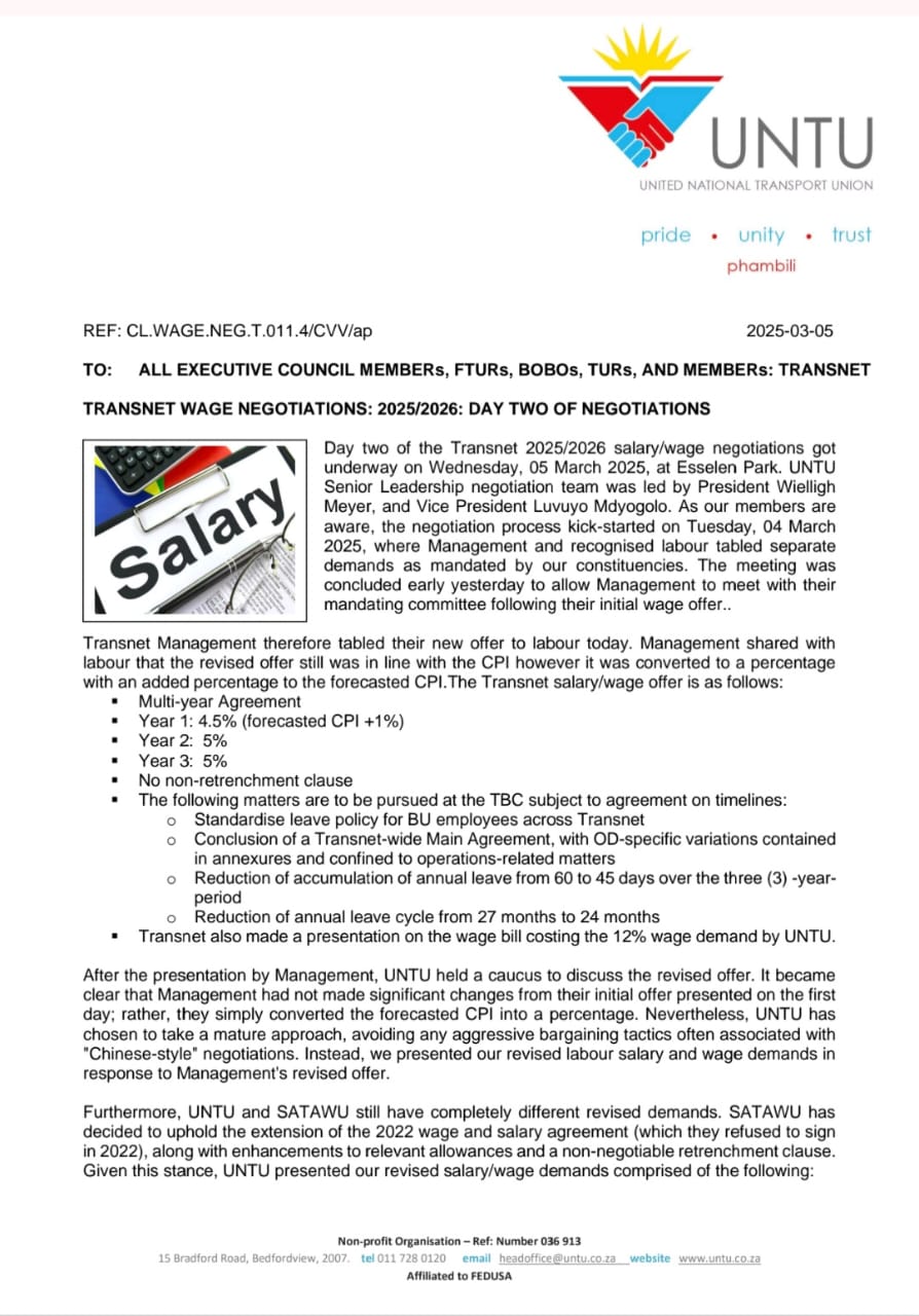 FEEDBACK: TRANSNET WAGE NEGOTIATIONS: 2025/2026: DAY TWO OF NEGOTIATIONS