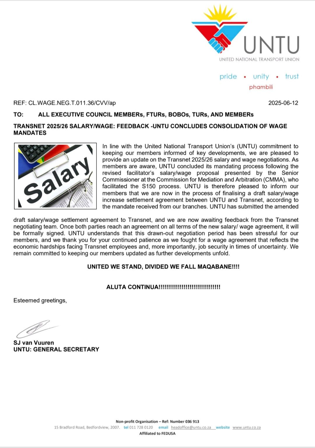 TRANSET 2025/26 SALARY/WAGE FEEDBACK: UNTU CONCLUDES CONSOLIDATION OF SALARY/ WAGE MANDATES