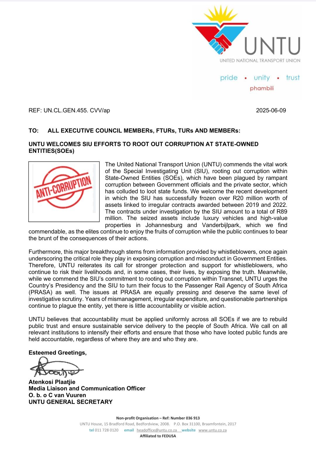 General Wages UNTU WELCOMES SIU EFFORTS TO ROOT OUT CORRUPTION AT STATE- OWNED ENTITIES(SOEs)2025-06-09in General 0 Comments 0 Likes